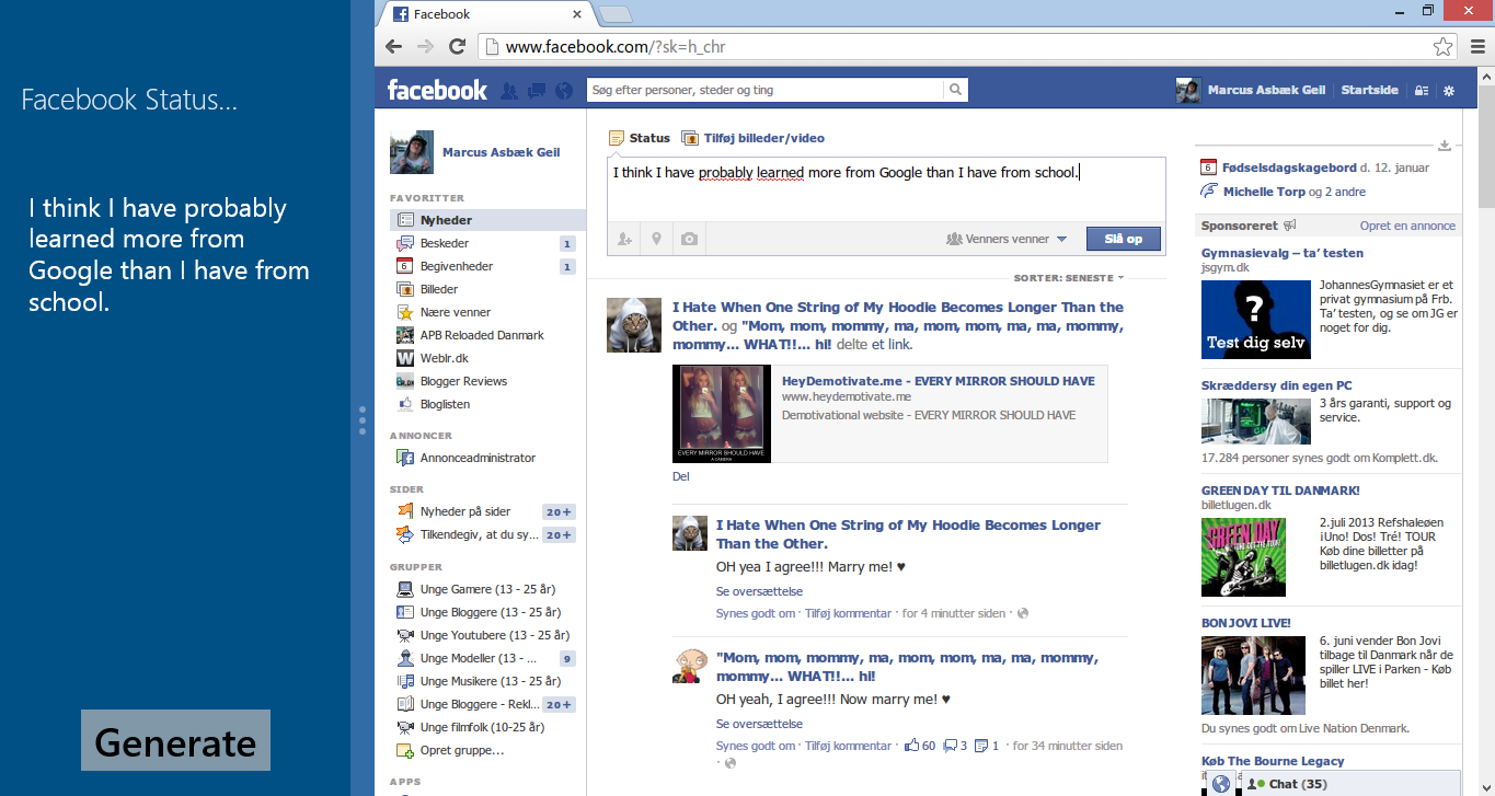 Idag har jeg valgt, at finde en af disse sjove Windows apps frem, som du næsten med garanti vil finde ganske interessant og måske kan få forholdsvist meget tid til at gå med. Denne af mange Windows apps, er nemlig så smart og underholdende, at den kan poste en masse tilfældige og sjove facebook status’ser, helt uden at du skal gøre andet end at slå applikationen til og fra.